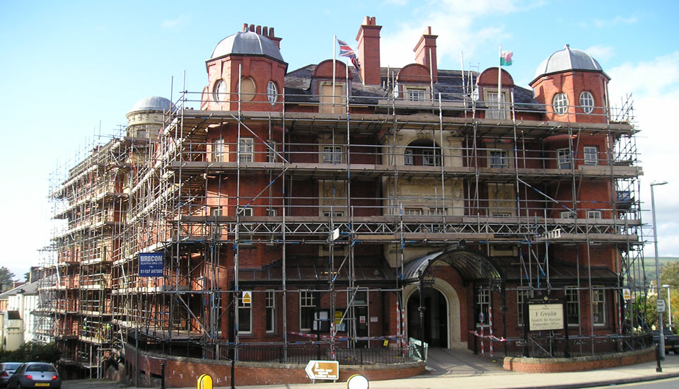 Fully boarded and guard railed access scaffolding to the external perimeter, at Powys County Councils Gwalia Building while undergoing major external refurbishment to for Carter Construction.